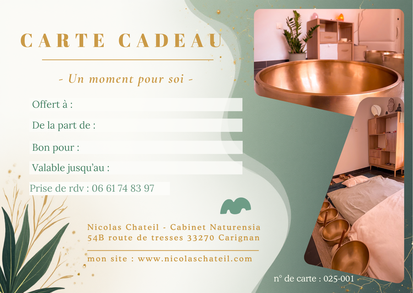 Pour offrir une carte cadeau pour un massage ou une séance de relaxation sonore, il vous suffit de remplir les champs du formulaire ci-dessous, ou bien me joindre par téléphone (appel ou message) au 06 61 74 83 97 avec toutes les informations nécessaires à la préparation de votre carte :